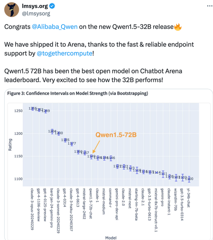 其中Qwen-1.5 72B曾在业界兵家必争之地:LMSYS Org推出的基准测试平台Chatbot Arena上夺冠,Qwen-72B也多次进入“盲测”对战排行榜全球前十。