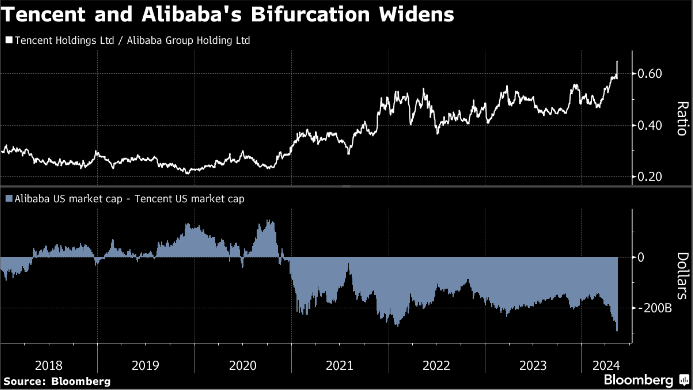 l 在两大互联网巨头报告了今年前三个月截然不同的财报后,腾讯控股有限公司相较于阿里巴巴集团控股有限公司的表现可能会进一步拉大差距。
