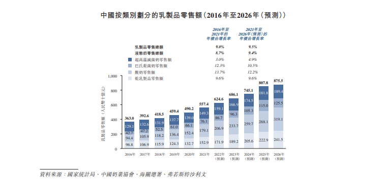 行业方面,近年来,中国乳制品行业发展迅速,增长潜力巨大。该增长主要由人均乳制品消耗量增加所带动,而人均乳制品消耗量增加的原因是城市化持续进行、可支配收入增加及消费升级。国内乳制品零售额由2016年的人民币3630亿元大幅增至2021年的人民币5574亿元,年复合增长率为9.0%。2021年,乳制品零售额显着增长13.7%。此外,乳制品零售总额预计将于2026年达到人民币8755亿元,2021年至2026年的年复合增长率为9.5%。