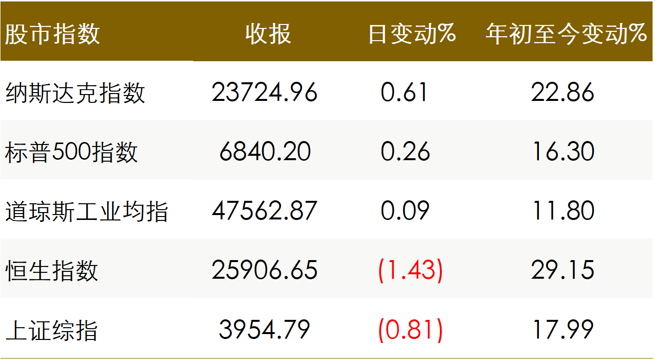· 美国股市主要股指周五收盘上涨,最大的推动力来自亚马逊乐观的盈利预测,但美联储对降息变得更加谨慎的担忧抑制了市场情绪。美国公债收益率涨跌互现,但周线大幅上涨,联邦政府长期停摆令市场前景蒙阴。日圆兑美元录得月度跌幅,此前日本央行对未来加息采取更加鹰派的立场令交易商失望。油价经历了疯狂的交易后小幅收高,因媒体报道称美国可能在数小时内开始空袭委内瑞拉而突然上涨,但在美国总统特朗普在社交媒体上发表否认声明后又有所回落。现货金收跌0.5%,报每盎司4001.78美元,受美联储今年能否再次降息的不确定性影响,但月线上涨3.7%。美国12月期金下跌0.5%,报每盎司3997美元。
