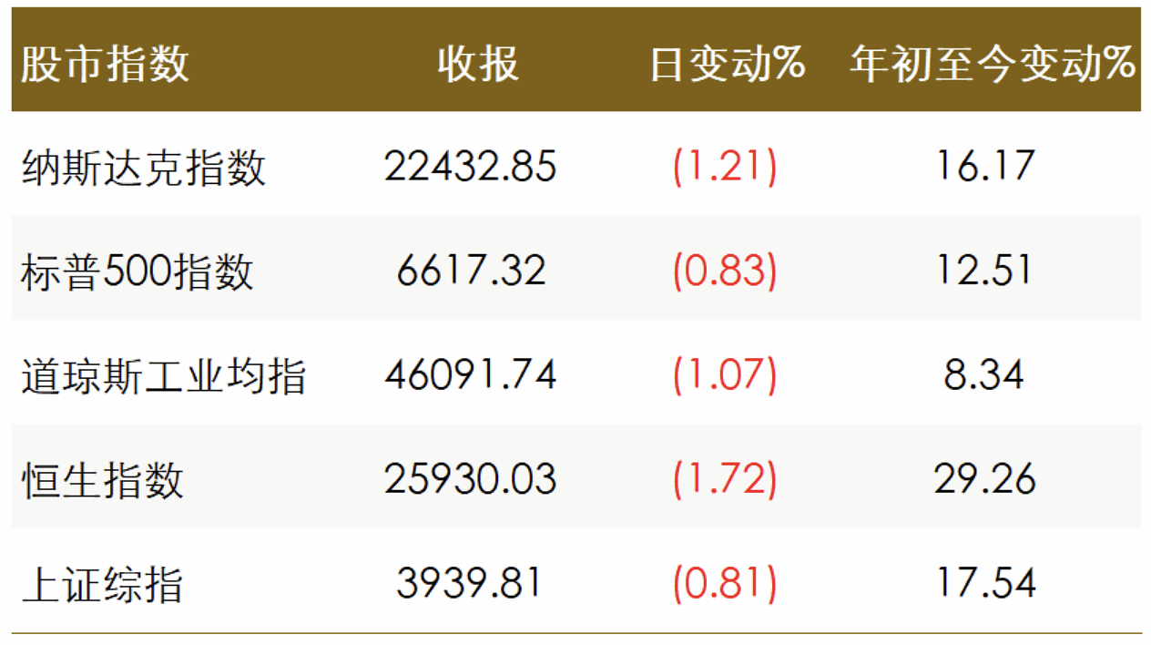 · 美国股市周二收跌,标普500指数连续第四个交易日下跌,创三个月来最长连跌纪录。美元兑日圆守住涨势,稍早创下九个半月新高,兑欧元也上涨。美国公债收益率因股市下跌提振了对避险债券的需求,同时劳动力市场指标疲软也提高了美联储下月降息的预期。油价震荡收高,交易员权衡西方制裁对俄罗斯石油出口的影响,以及美国总统特朗普表示其政府已开始面试下一任美联储主席的消息。金价从一周低位回升,受助于美国就业数据疲软,在本周公布更多延迟的美国数据之前,投资者评估美联储12月降息的可能性。