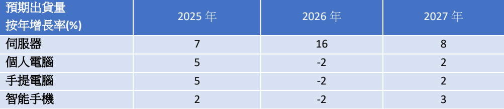 然而,随着存储器价格持续上升,凯基预期 2026 年个人计算机与智能手机存储器成本将按年增长超过50-60%,多数品牌将提高产品售价,转嫁部份成本给消费者,降低对利润率的负面影响,但此将不利2026 年产品需求,故凯基下调 2026 年全球个人计算机出货量预估至按年减少 2%,反映消费个人计算机与Chromebook 需求受影响,2026 年全球智能手机出货量预估按年减少 2%,而中低阶机种受冲击程度将超越例如 iPhone 等高阶机种,因高阶机种比重较高且已与供应商签订长约,成本压力较中低阶机种轻。