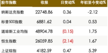 美股三大指数下跌,道指跌超过1%,标普500指数及纳指则分别下跌0.43%及0.92%。反映中概股表现之金龙指数亦跌逾1.8%。
